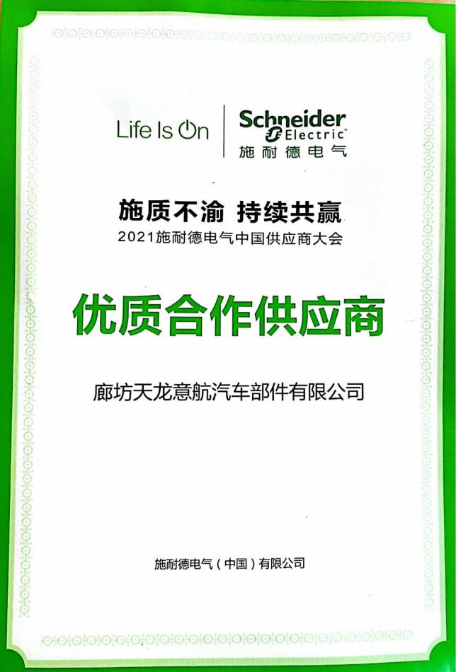 【概要描述】廊坊天龍意航汽車部件有限公司在2021年施耐德電氣中國(guó)供應(yīng)商大會(huì)中榮獲“優(yōu)質(zhì)合作供應(yīng)商”稱號(hào)。該榮譽(yù)的取得,是廊坊天龍與施耐德共同合作、相互理解、相互信任的碩果,也得益于我司一貫秉承“敬業(yè),誠(chéng)信,進(jìn)取,感恩”的經(jīng)營(yíng)理念,標(biāo)志著我們以精良的產(chǎn)品,優(yōu)良的服務(wù),優(yōu)越的品質(zhì),在持續(xù)提升客戶滿意度這一發(fā)展理念上再上新臺(tái)階。廊坊天龍今后將繼續(xù)以市場(chǎng)需求為導(dǎo)向,著眼長(zhǎng)遠(yuǎn),立足大局,以更好的質(zhì)量水平,以新的思想、